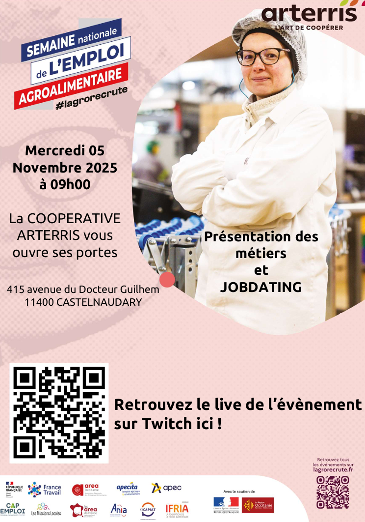 La coopérative ARTERRIS organise dans le cadre de la SEMAINE NATIONALE DE L’EMPLOI DANS L’AGROALIMENTAIRE, une matinée portes ouvertes sur son siège social à Castelnaudary (11).