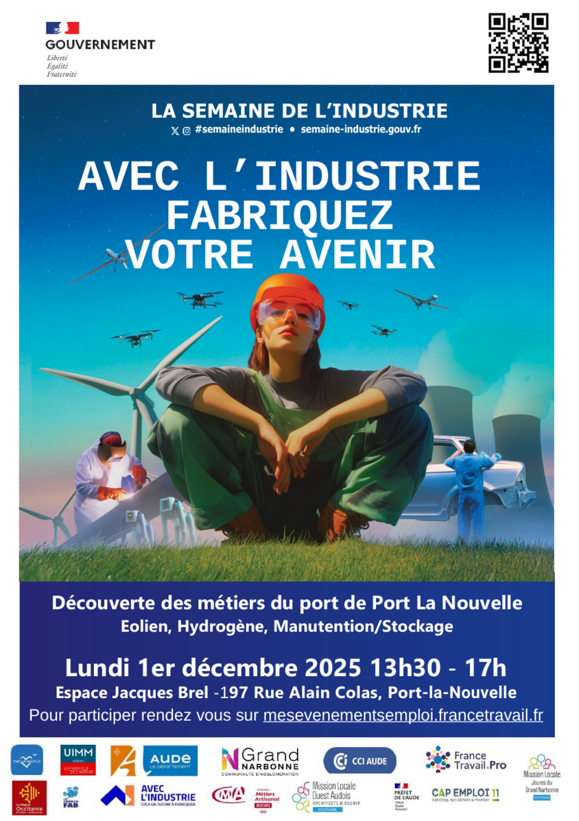 Cette action Découverte des métiers du Port : éolien, hydrogène, manutention/logistique à Port-La-Nouvelle est organisée par le Réseau Pour l’Emploi élargi dans le cadre du groupe de travail les métiers de l’économie verte du CLPE de Narbonne-Lézignan Corbières et rattachée à la Semaine de l’Industrie (ce groupe de travail mobilise les partenaires Région Occitanie, DDETS-PP, Agglomération du Grand Narbonne, Conseil Départemental, France Travail, Mission Locale Jeunes du Grand Narbonne, Mission Locale Ouest Audois, Cap Emploi, CCI de l’Aude, CMA de l’Aude, Lycée Louise Michel de Narbonne, UIMM et OPCO 2i).