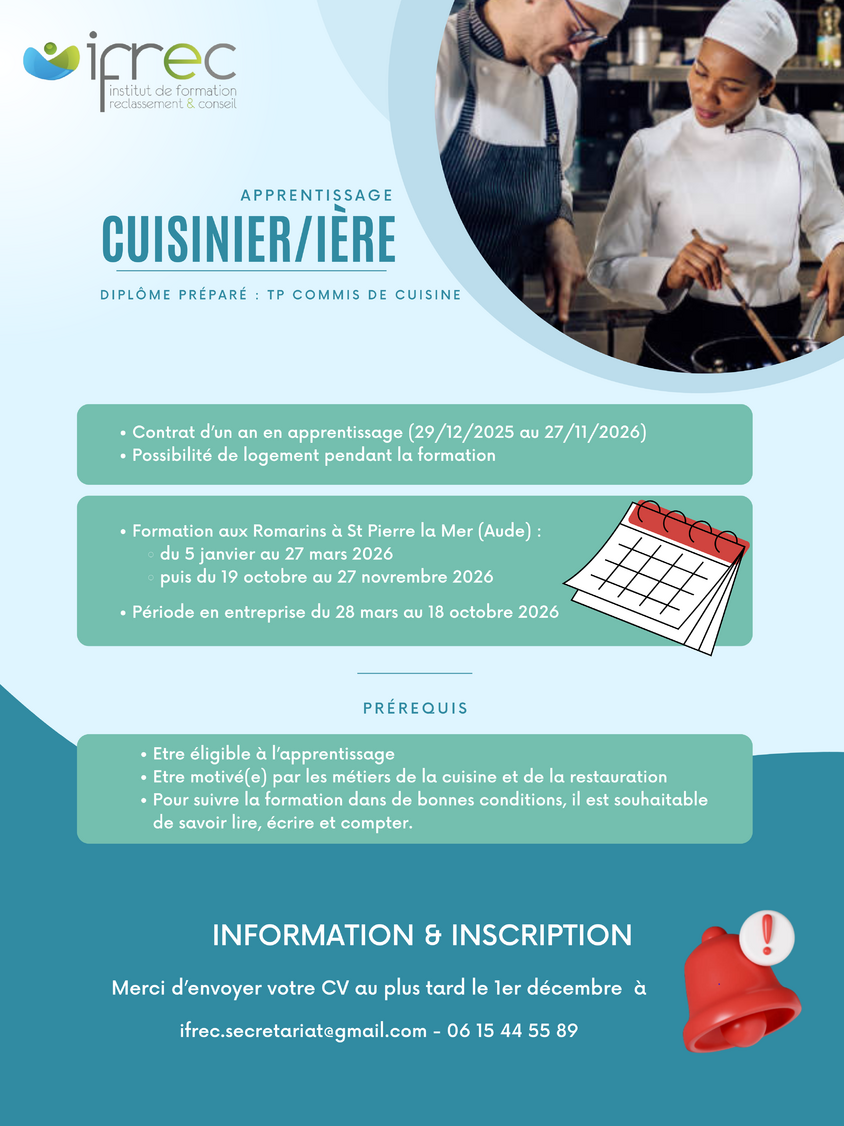 Formation en apprentissage au titre professionnel de commis de cuisine avec l'IFREC