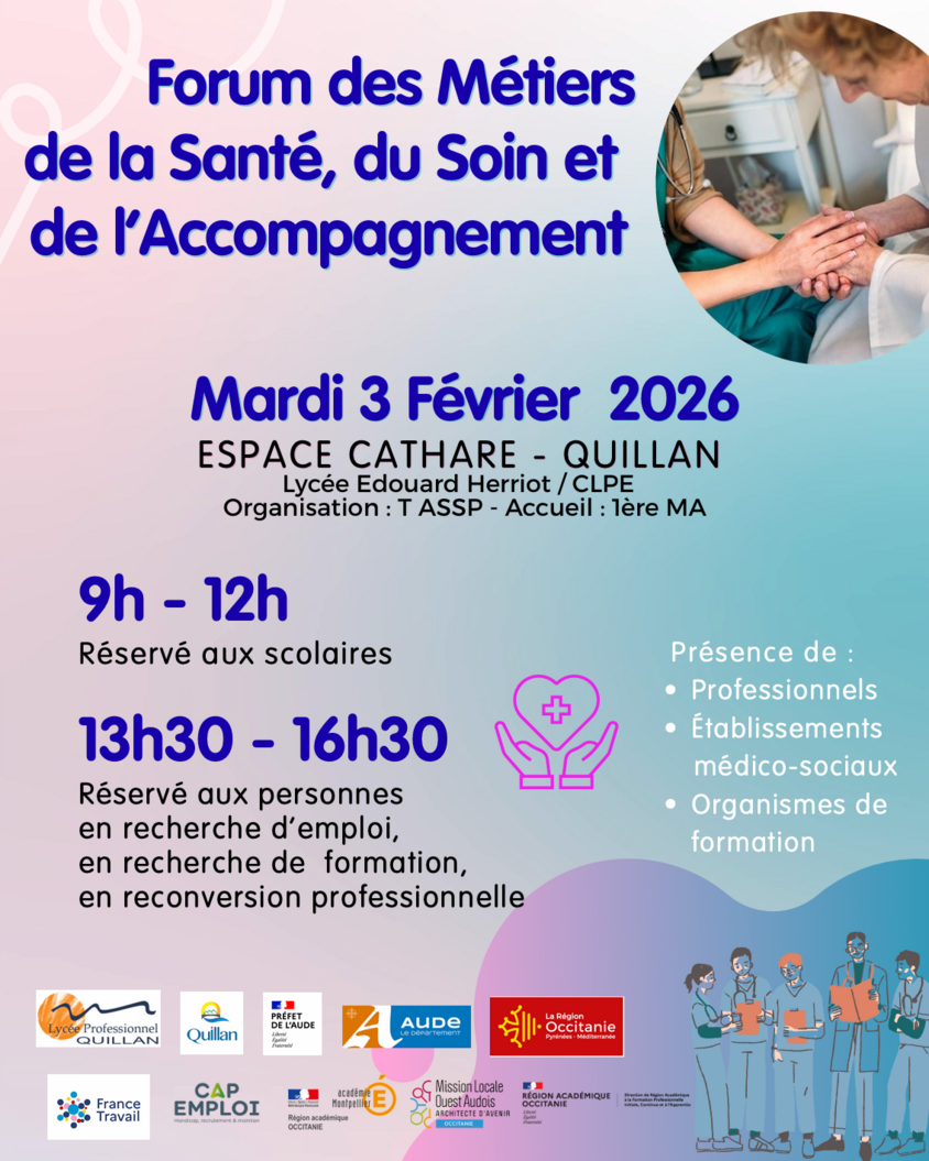 Le Forum de la Santé, du Soin et de l'Accompagnement se tiendra le 3 Février 2026 à l'espace Cathare, place de la gare à Quillan de 13h30 à 16h30.