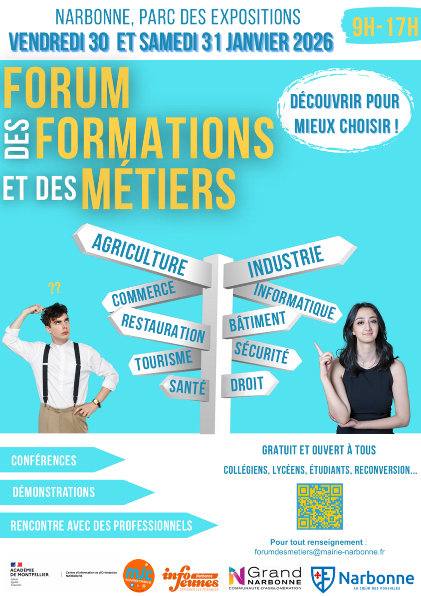 Le Forum des formations et des métiers revient le vendredi 30 et samedi 31 janvier 2026, de 9h à 17h, au Parc des Expositions de Narbonne.