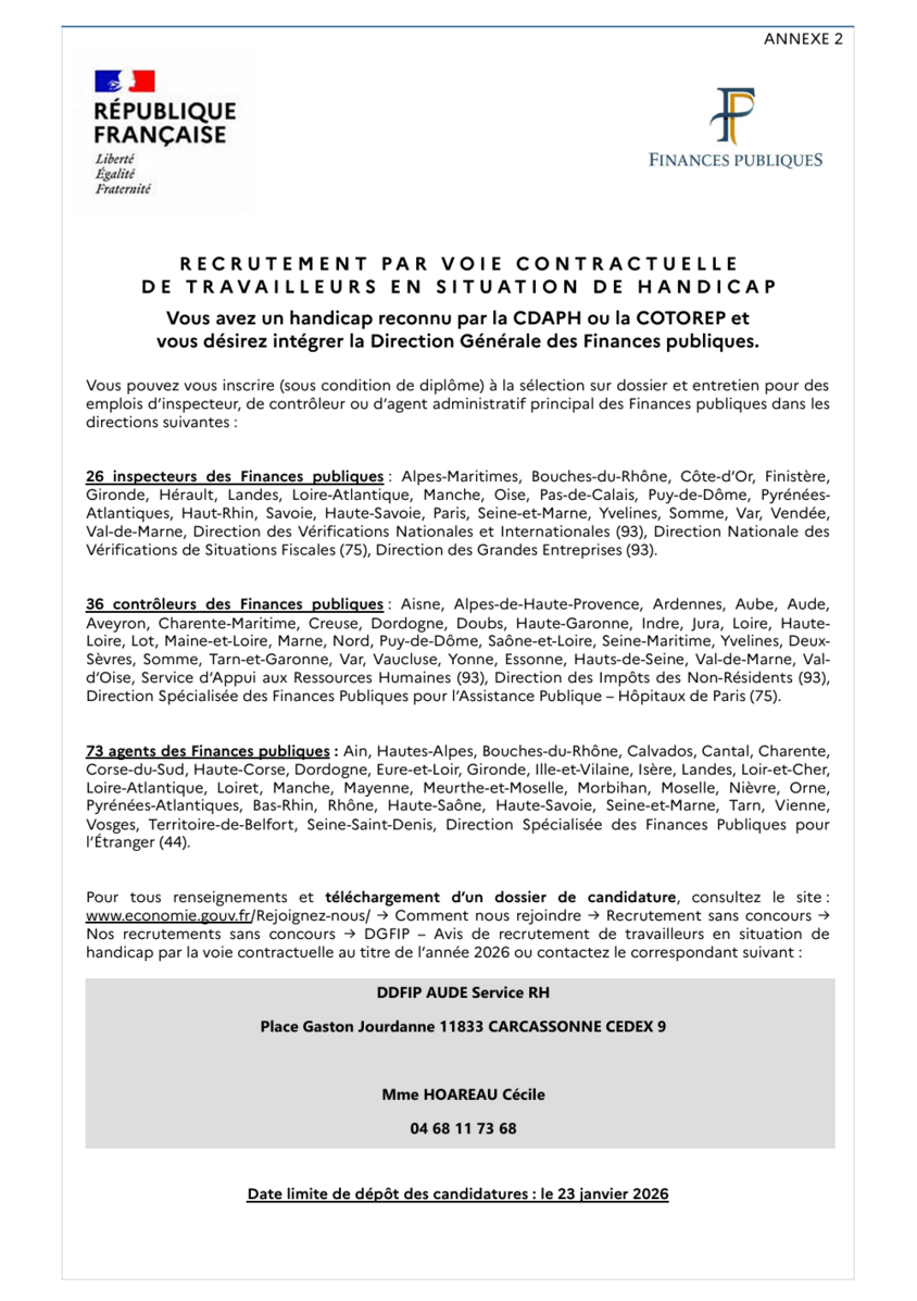 La DDFIP de l'Aude recrute par voie contractuelle des travailleurs en situation de handicap pour 2026