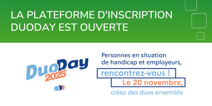 DuoDay 2025 se tiendra le jeudi 20 novembre partout en France, dans le cadre de la Semaine Européenne Pour l’Emploi des Personnes Handicapées (SEEPH) ! La plateforme est dès à présent ouverte pour les inscriptions !